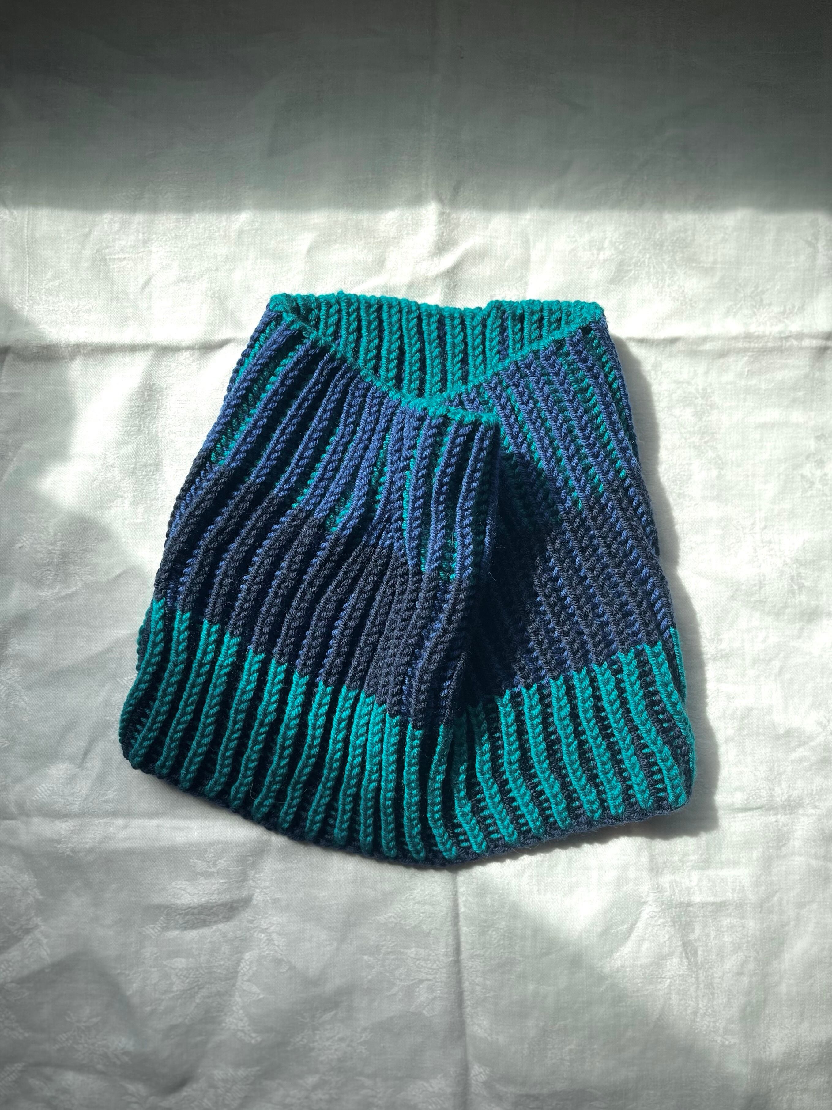 ・1段を2回に分けて編むので、通常(メリヤス編み)と比べて1.5〜2倍の糸を使用しています。